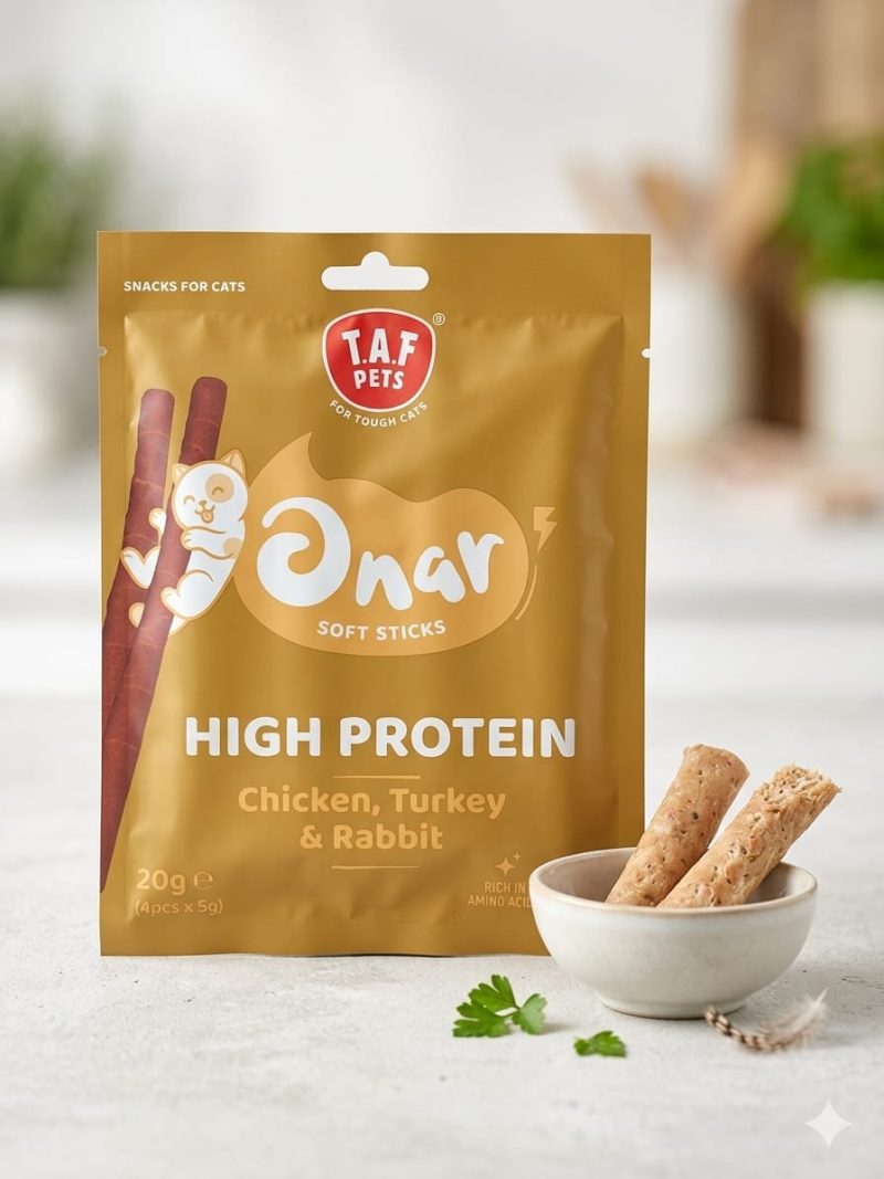​Treat your cat to a gourmet snacking experience with Onar Soft Sticks. Specially crafted for “tough cats” who deserve high-quality nutrition, these savory treats combine three premium protein sources—Chicken, Turkey, and Rabbit—into a tender, irresistible texture.