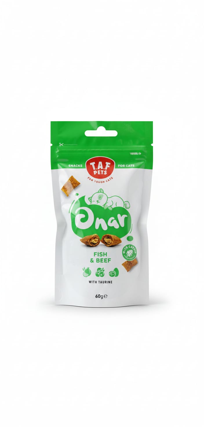 ​Treat your feline friend to a gourmet snacking experience with Onar Fish & Beef. These crunchy pillows are specially formulated for “Tough Cats,” providing a flavorful reward packed with functional health benefits.